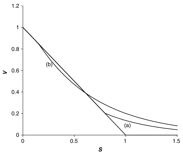 Another way of looking at the condition of continuity of delta is to consider what happens if the delta is not continuous at the exercise point. The two possibilities are shown in below and curve (a) corresponds to exercise that is not optimal because it is too early while in (b) there is clearly an arbitrage opportunity i.e. exercise is too late.