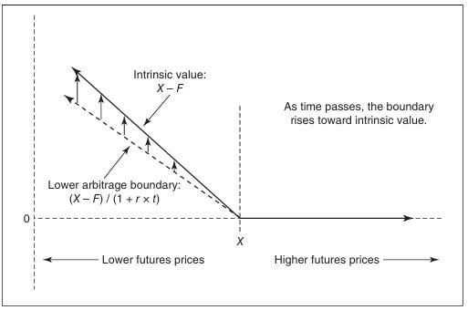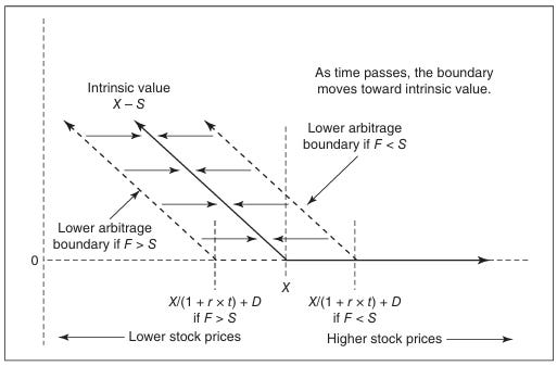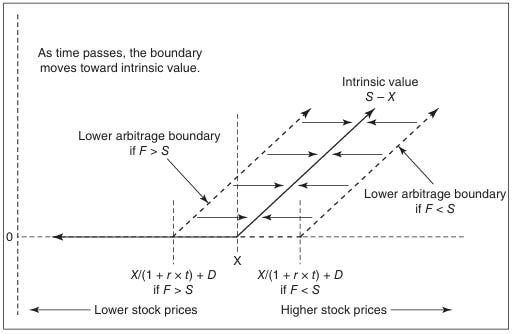 where D is the dividend. Moreover, for underlying that are not stocks, other costs and benefits of carry should also be added into the arbitrage consideration. Depending on if the forward price F is greater or less than the spot price S, the lower arbitrage boundary is presented below (graphic from Natenberg figure 16-3):