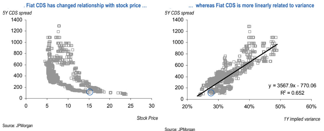A simple regression would have treated CDS like a €15 strike put on the stock; building a trade with a €15 put against CDS would mis-specify the capital structure. Because implied variance already incorporates some of the reduced risk, the Fiat CDS vs implied variance relationship is more stationary. In practice, traders may use some combination of variance and the underlying equity to express the capital-structure view (not just variance alone).