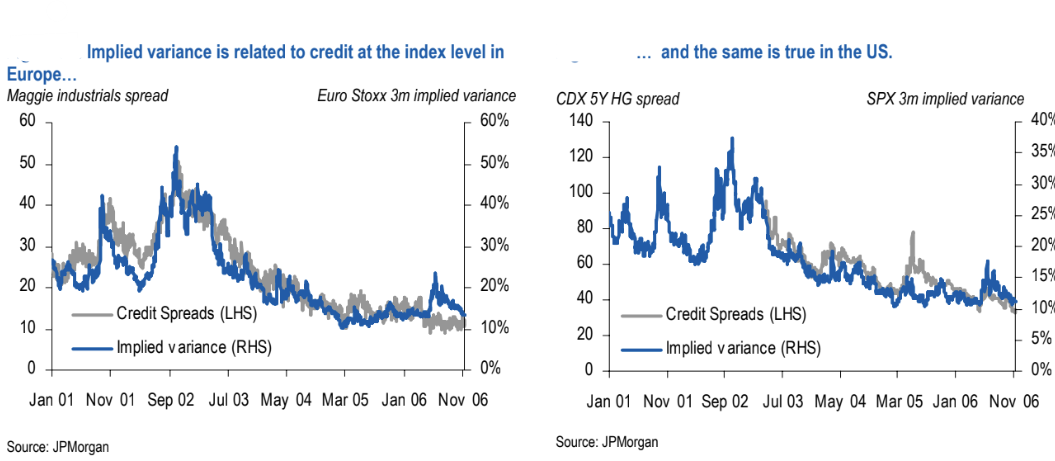 Variance swaps (on equities or indices) and credit default swaps (CDS) both put a price on a firm’s risk. Over time, they should be correlated. This is clear at the index level. Europe: Credit and CDS indices such as Maggie and iTraxx show a strong relationship to Euro Stoxx 50 3-month implied variance. US: CDX HG and HY indices are well correlated with S&P (SPX) 3-month implied variance.