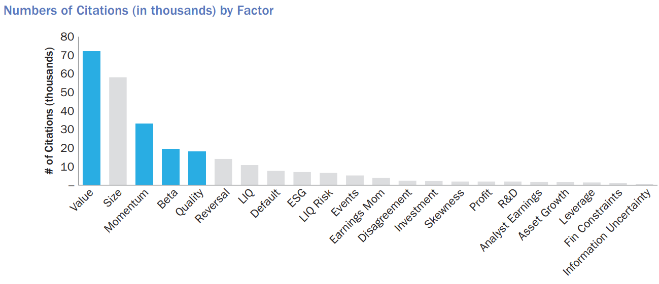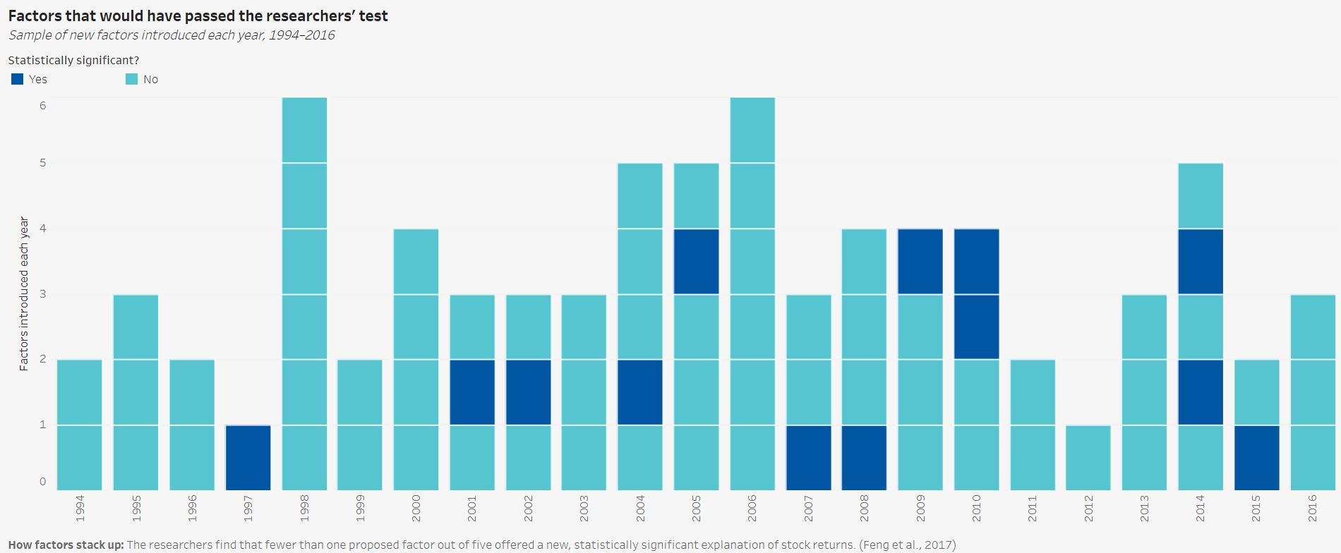 It may be tempting to use the entire set of existing factors as a benchmark when evaluating new ones. But with limited data, the curse of dimensionality undermines statistical significance. One study of 99 of the most cited factors over the past decade found that only 13 held significant explanatory power—underscoring the need for skepticism when assessing the hundreds of factors in the academic literature.