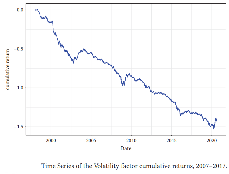 The volatility factor is closely related to the beta factor, and its returns are defined as those of a dollar-neutral portfolio that is long high-volatility stocks and short low-volatility stocks. There is a direct relationship to the beta factor, since beta itself depends on a stock’s volatility. From regression, we know that