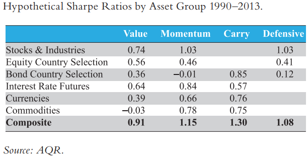 We now summarize results from AQR research on the 4 most well-established factors. We ignore the size factor here because although there is much publication about it, its current existence is under intense debate.