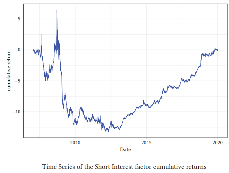 The Short Interest factor can be measured in a few different ways, short ratio, short-to-float, days-to-cover, utilization rate, borrow cost, etc… It is debated whether there is a persistent negative premium associated with short interest.