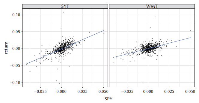 A factor in the context of stock return models is a measurable characteristic or variable that can explain or predict a stock's return (conversely, a factor would also explain or predict a stock’s risk). For example, the most common one-factor model for predicting returns would be to use the market factor. One would expect a cyclical stock in the financial sector like Synchrony Financial (SYF) to move more in sync (pun intended) with the market than Walmart (WMT) which is a large, stable, defensive stock. The figure below from APM show the regression of SYF and WMT daily returns against S&P 500 futures from January 2 2018 to December 31 2019.