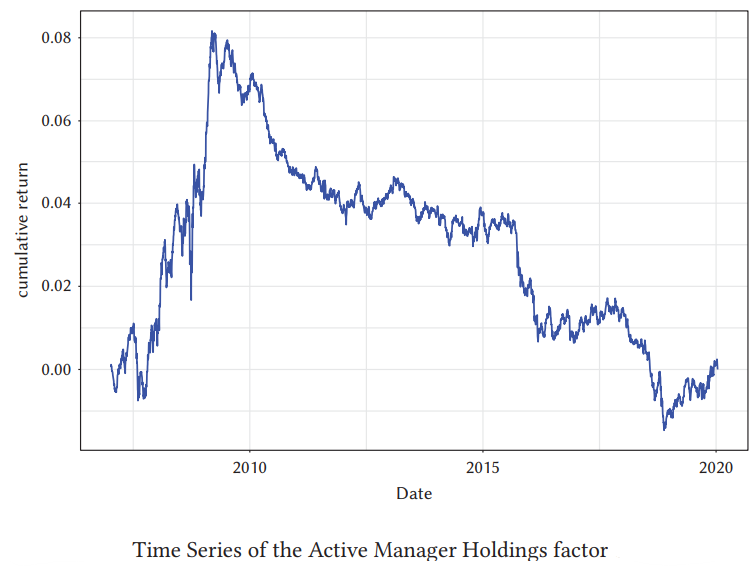 The Active Manger Holdings factor is the positive counterpart to the short interest factor. There is variation across active investors, but there is commonality as well, and it is captured by this factor. In some sense, like the short interest factor, AMH can be interpreted as a measure of “crowding”. Again, it is debated if a premium exists.