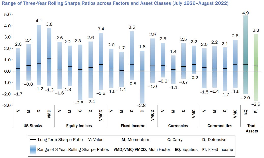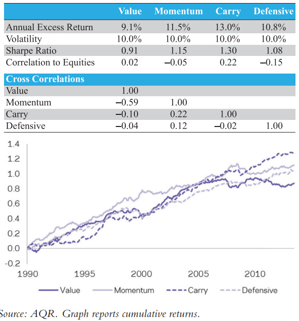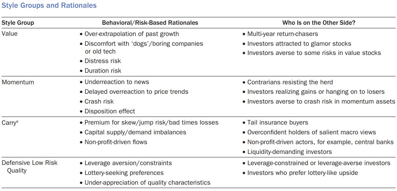 These are factors that we have previously discussed. Value is the tendency for cheap assets to outperform expensive ones, momentum is the tendency for recent performance to continue into the near future, carry is the tendency for higher-yielding assets to provide returns above those of lower-yielding assets, and defensive is the tendency for low beta stocks to outperform on a risk-adjusted basis. Each factor lends itself both to risk-based and behavioral explanations: