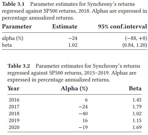 Alpha is challenging to estimate accurately, as historical data shows large confidence intervals and high variability over time. Unlike beta, which tends to be more stable, alpha estimates are often unreliable when derived from time series data alone. See estimates of beta and alpha for SYN below from APM: