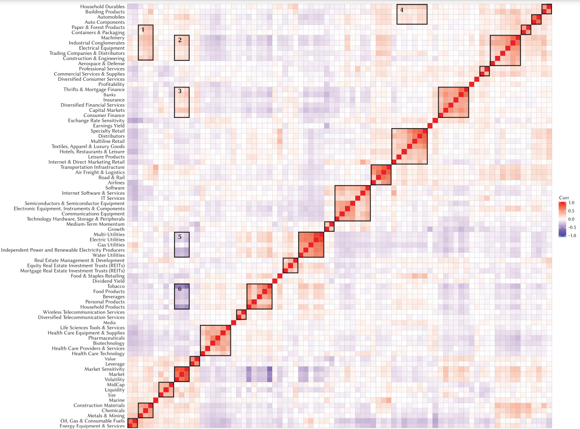 Factors have proliferated rapidly in both academic literature and practical applications. Commercial risk-model providers often include dozens of factors—typically between 50 and 100—to ensure comprehensive coverage of potential risk drivers. When you examine the correlation matrix of these factors, distinct clusters emerge. Common groupings include industry-specific clusters (such as financials, healthcare, and consumer retail) and broader market factors (like overall market sensitivity and volatility). These clusters and their interrelationships often have intuitive economic explanations.