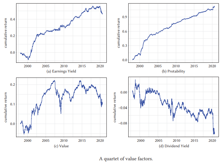 The characteristic most frequently used to measure the value factor is the book-to-price (B/P) ratio. However, this metric is increasingly outdated in an economy where much of a company’s value resides in intangible assets. As a result, “value” is often defined using alternative ratios—sales-to-price, free-cash-flow-to-price, earnings-to-price, EBITDA-to-enterprise-value, dividend yield, net income, and so on. Indeed, fundamental investors have employed a wide array of intrinsic-value metrics since the dawn of value investing, raising the risk of overfitting. Depending on how “value” is defined, a dollar-neutral long-short portfolio can exhibit either a positive or negative premium.