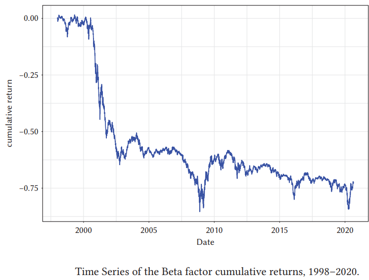 This factor should not be confused with a stock’s beta exposure to the market. Here, the factor return is defined as the P&L of a dollar-neutral portfolio that is long high-beta assets and short low-beta assets (using, for instance, the S&P 500 in the US). By CAPM, one would expect this portfolio to have positive returns, since high-beta assets exhibit greater sensitivity to a market with positive expected returns. Empirically, however, betting against beta is often profitable. One explanation is that many investors (e.g., pension funds) face constraints against shorting or using leverage. To chase returns, they overweight high-beta stocks (or private-equity-like assets), creating excess demand and driving prices above intrinsic value. Over the long run, this overpricing leads to negative returns for the high-beta segment. See graph from APM.