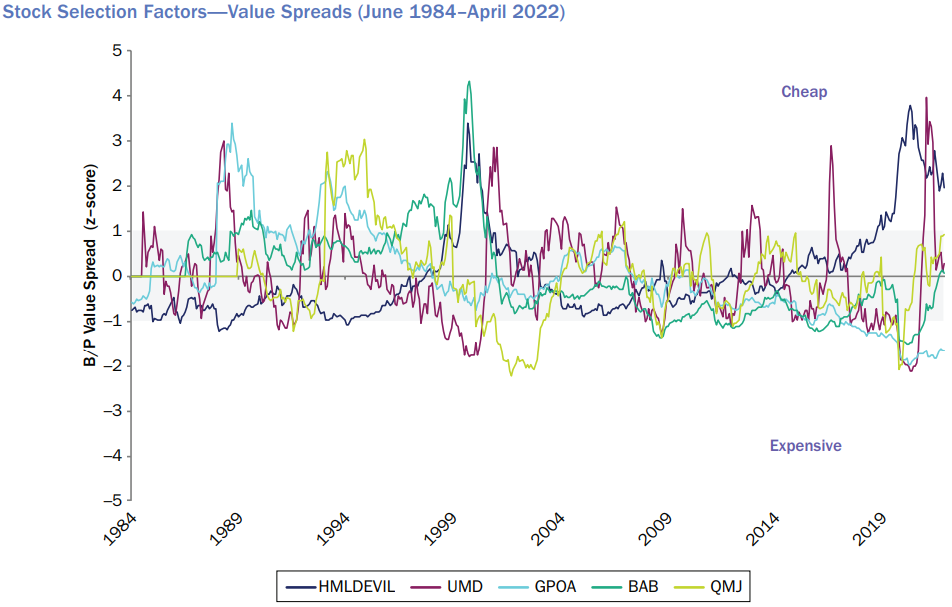Factors can experience significant drawdowns, volatility, and periods of underperformance relative to the broader market. Moreover, as factors become widely known and adopted, their effectiveness may diminish due to crowding or changes in market dynamics. Below, we plots the time series of valuation spreads of value (HMLDEVIL), momentum (UMD), profitability (GPOA), defensive (BAB), and quality (QMJ) factors. The value spreads indicate whether a factor looks “cheap” or “expensive” relative to its history:
