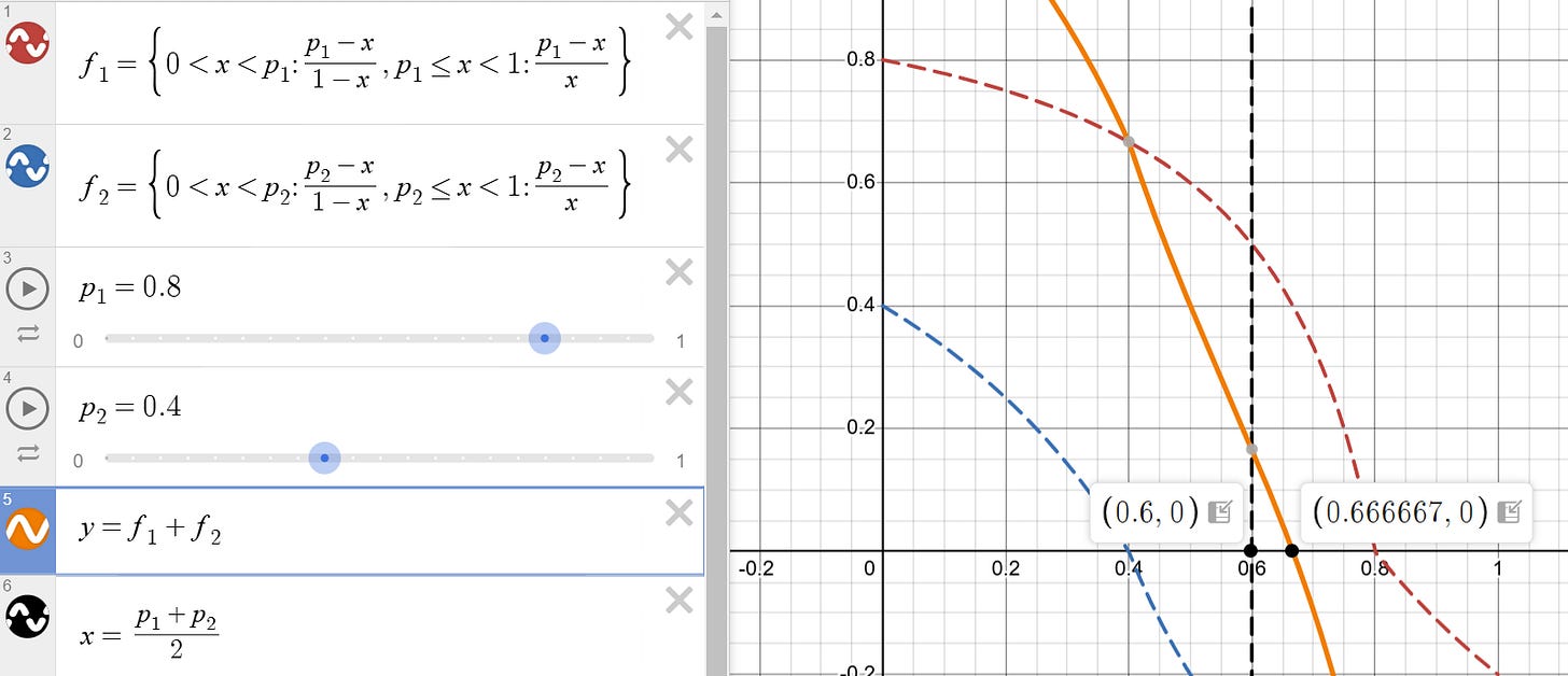 Which is evidently not the money / participant weighted average of probabilities. For example, if p1 = 0.8 and p2 = 0.4, the crossing probability would be 2/3 instead of 0.6. I have made a Desmos Simulation for those who want to explore other values (the crossing price is given by the x-intercept of f1+f2 in the graph).