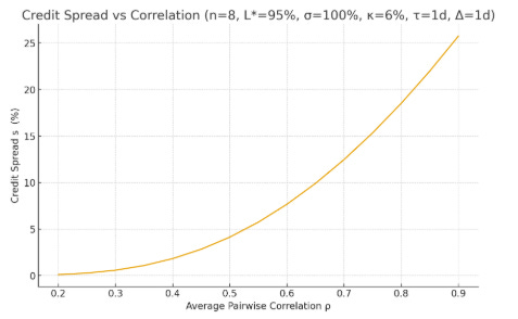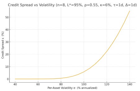 This expression is a useful because it says diversification kills idiosyncratic noise but leaves a correlation floor of σ times the square root of ρ. That floor is what senior mortgage tranches “see” when the housing market turns together, and it is what safe crypto loans “see” when BTC, ETH, and altcoins lurch in the same direction. Because expected losses in risk-neutral pricing scale with volatility and the frequency of hitting a liquidation threshold, σ of the aggregate collateral portfolio is the natural bridge from “how correlated/volatile is the basket?” to “what spread is fair?”