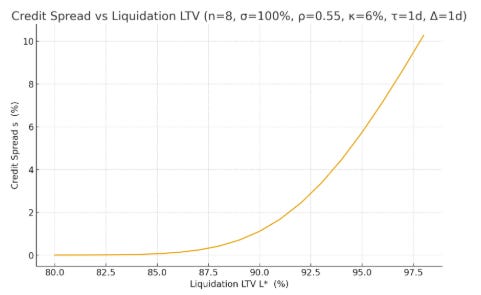 In traditional finance, the spread on a collateralized debt obligation (CDO) compensates investors for the chance that a bunch of seemingly independent assets will default together when the world turns bad. Over-collateralized crypto loans work on the same principle. Each borrower is oversecured and the system as a whole is robust until correlations spike, liquidity dries up, and everyone scrambles to liquidate at once. In this sense, the spread on crypto lending (or the implied CDS premium) is the price of liquidation correlation and jump risk.